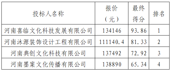 评选小组成员根据综合评分进行了评选,最终结果已经产生,中标单位为河南喜临文化科技发展有限公司,报价金额:134146元。